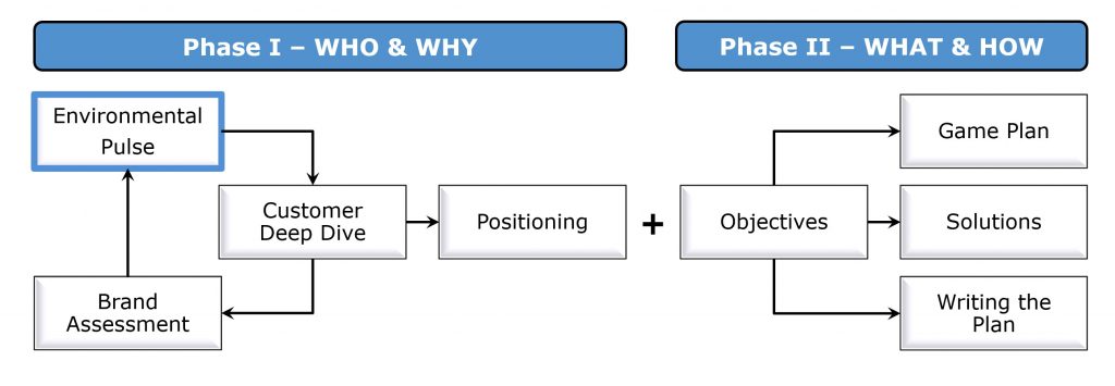Participants start with an environmental pulse to understand external trends, followed by a customer deep dive to uncover true needs and motivations. A brand assessment helps clarify strengths and weaknesses, leading to a clear positioning that defines how the organization stands out and why it matters.